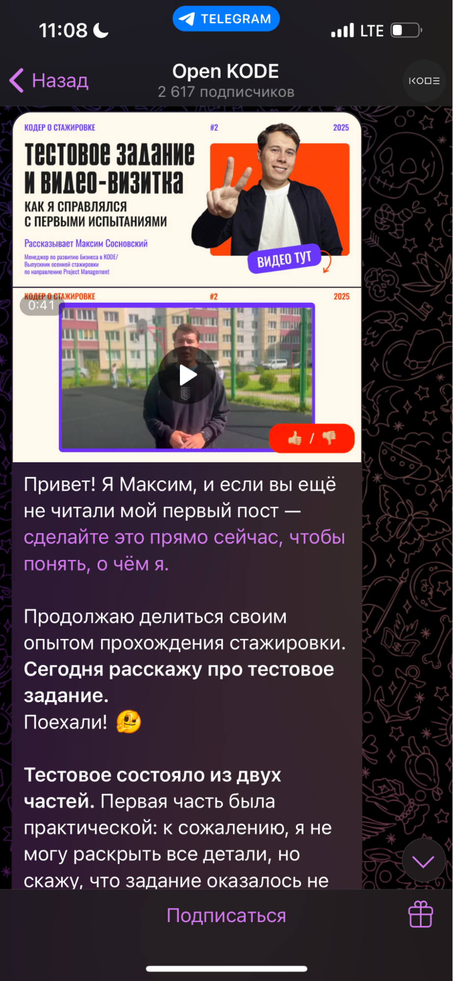 Так, у прошлой стажировки появился амбассадор-инфлюенсер — Максим, выпускник предыдущего потока. Он рассказывал, как боялся браться за тестовое, как сомневался в себе, как справлялся с первыми провалами и радовался маленьким победам.