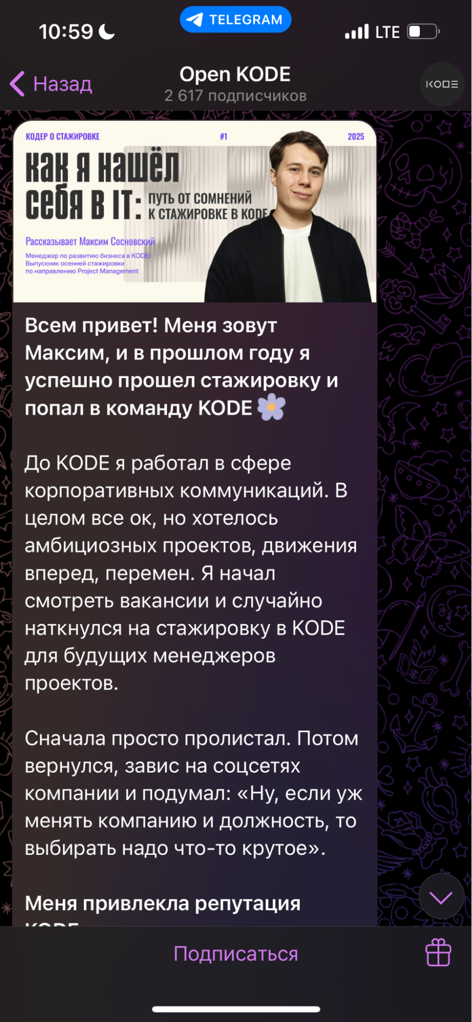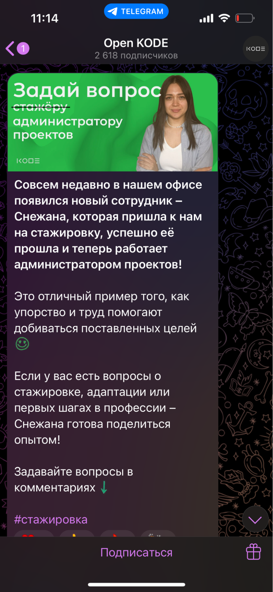 Все охваты кампании мы сводим в наш Telegram-канал. Там появляются анонсы стажировки, прямые эфиры, интервью и обсуждения. Но удерживает внимание не только сама компания, а истории людей, которые только что прошли этот путь.