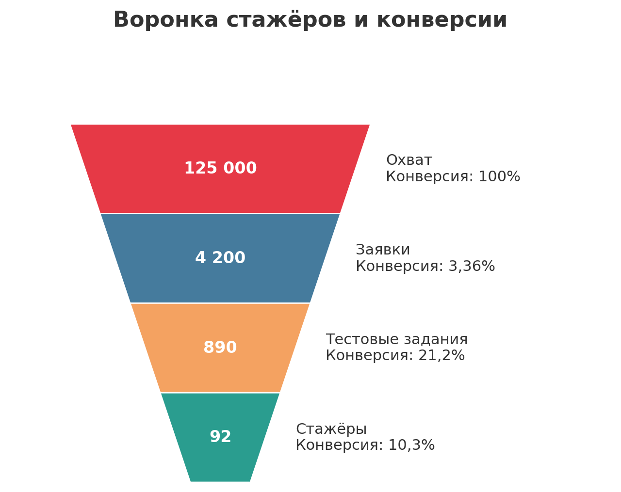Чтобы собрать один поток стажировки, нужна широкая воронка. Весной 2025 года нашу PR-кампанию увидели 125 тысяч человек. Мы получили 4 200 заявок и 890 тестовых заданий. В итоге на стажировку вышло 92 человека. На первый взгляд кажется, что это слишком жёсткий отсев, но это нормально: так формируется команда из самых талантливых и мотивированных ребят.