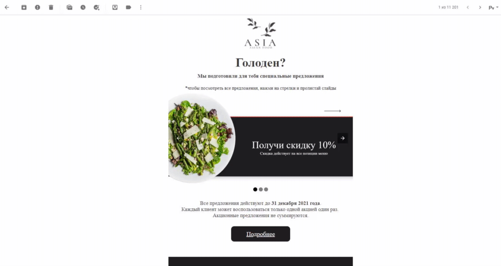 Чтобы активнее вовлекать пользователя и больше персонализировать под него сообщение, используйте AMP-письма (с интерактивом) и динамический контент: создавайте миниатюру сайта в письме. Пусть подписчик выбирает размер, бронирует время доставки или отвечает на опрос, не покидая инбокса. Это не «фишка», а конверсия без трения.