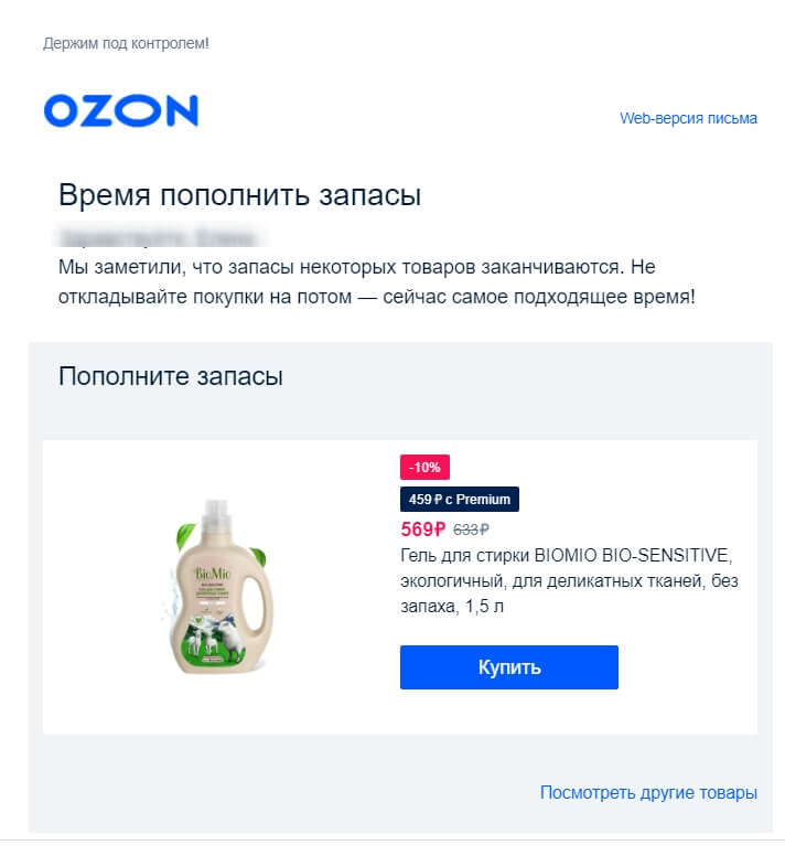 С помощью автоматических писем Ozon помогает клиентам не забыть вовремя пополнить запасы