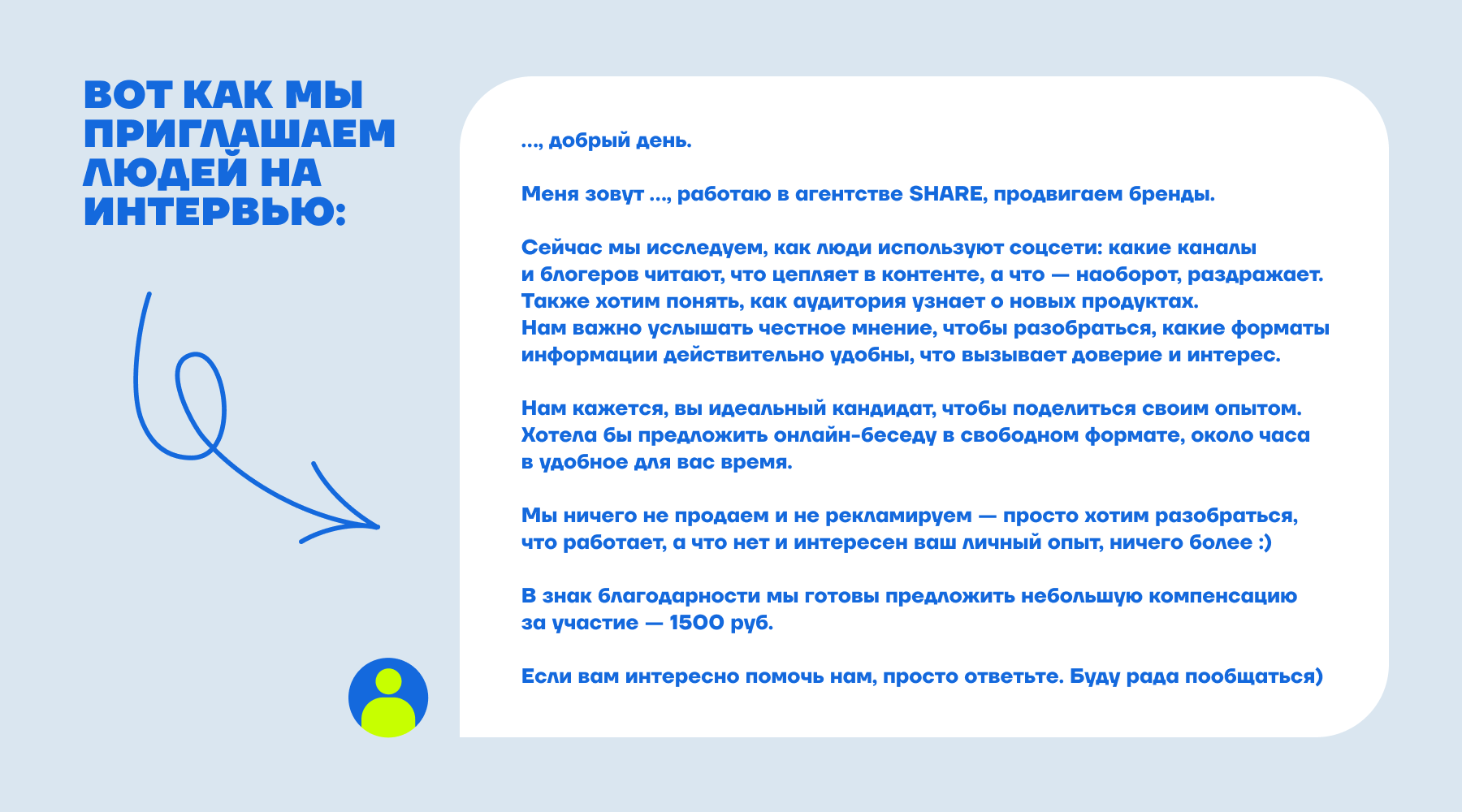 Что хотите обсудить — ключевой вопрос, который и станет целью исследования. Чтобы его сформулировать, задумайтесь: если бы была возможность спросить что-то одно у аудитории, чтобы вы спросили?
