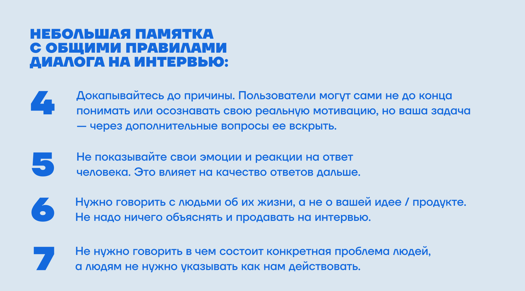 «Мне нравится метод „5 почему“ — обычно пяти вопросов достаточно, чтобы добраться до истины. Интервьюер не должен стесняться уточнять у респондента, почему он думает так, а не иначе».