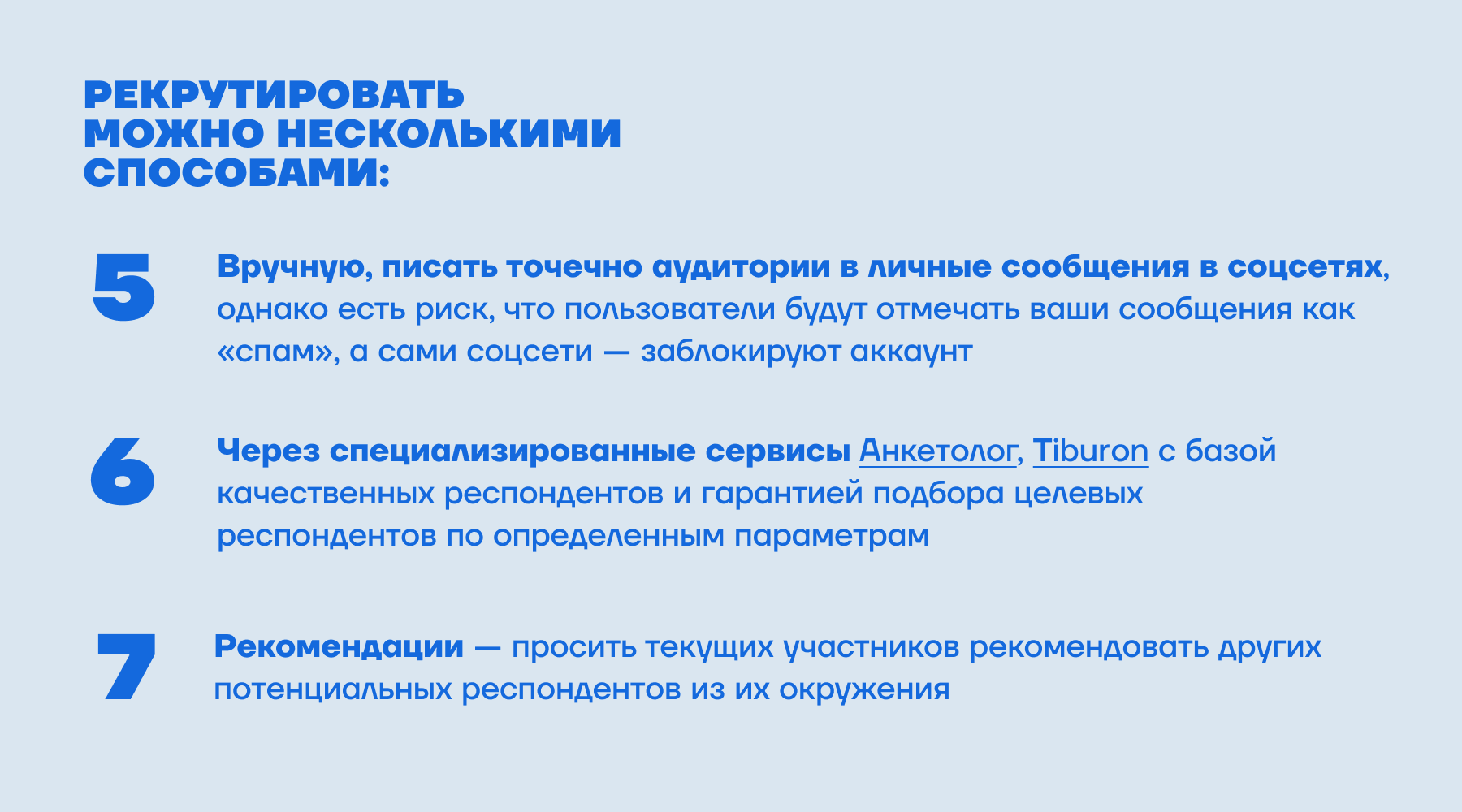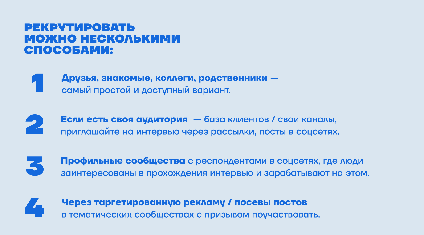Подбор респондентов называется рекрутингом. Найти желающих принять участие в исследовании проще, чем кажется. Мы собрали несколько способов, которые облегчат эту задачу.
