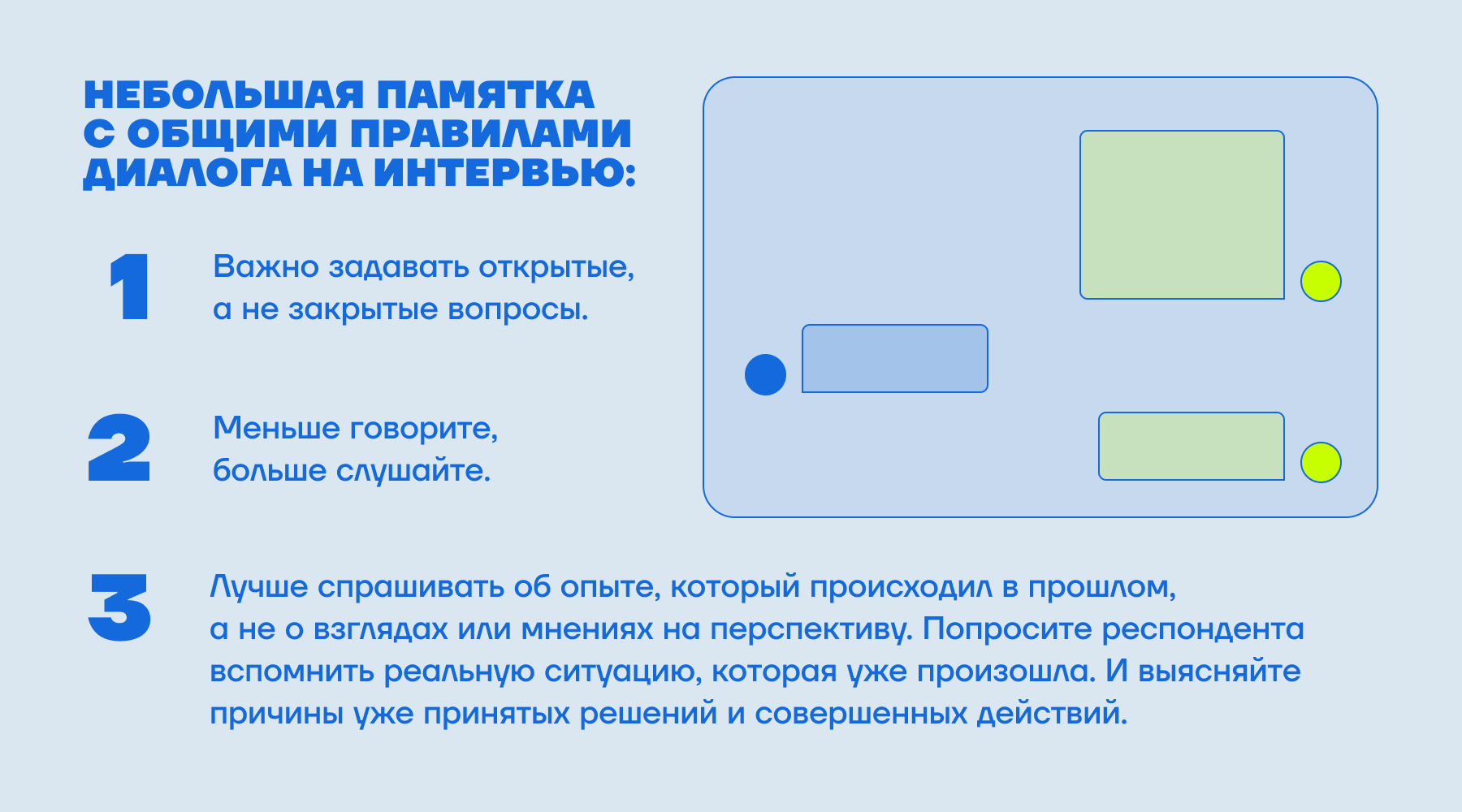 Как вести диалог. Начните разговор со смолл-тока и попросите собеседника рассказать немного о себе. Так вы проявите внимание и расположите респондента к себе. Затем напомните тему интервью и переходите к основным вопросам.