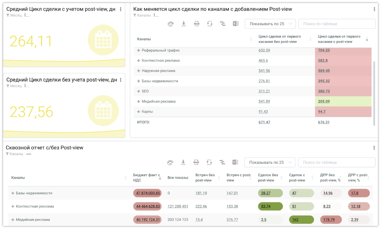 Обычные модели атрибуции (по первому или последнему касанию) не учитывают влияние охватных медиа и директ-маркетинг: email-рассылки, SMS, push-уведомления. А post-view аналитика отслеживает путь клиента от просмотра объявления до сделки, учитывая даже отложенные действия.