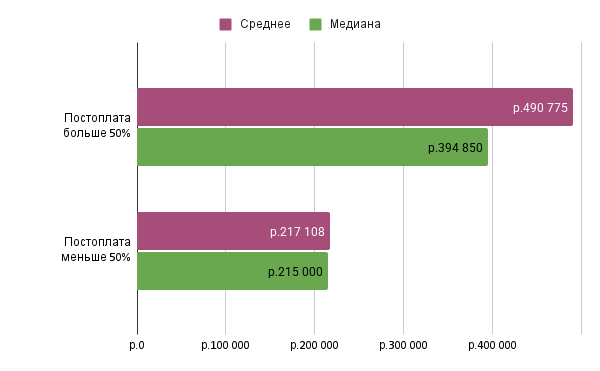 Работать по постоплате дороже, чем по предоплате. Мы попросили агентства указать, какой процент их клиентов работает по предоплате и постоплате. Те агентства, в которых больше половины клиентов работают по постоплате, берут за свои услуги почти вдвое дороже: 394 850 рублей за базовый набор услуг против 215 000 рублей за тот же объём услуг.