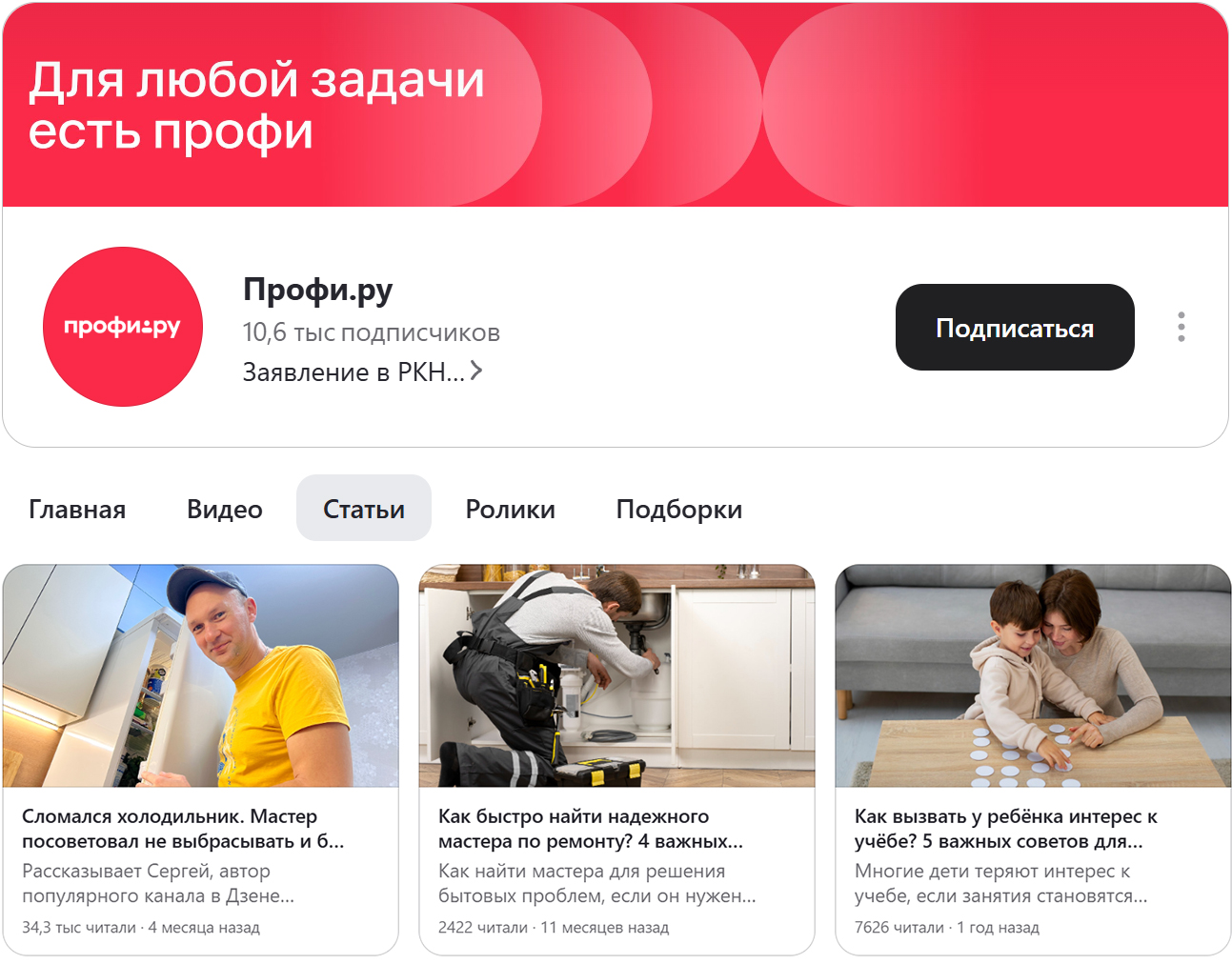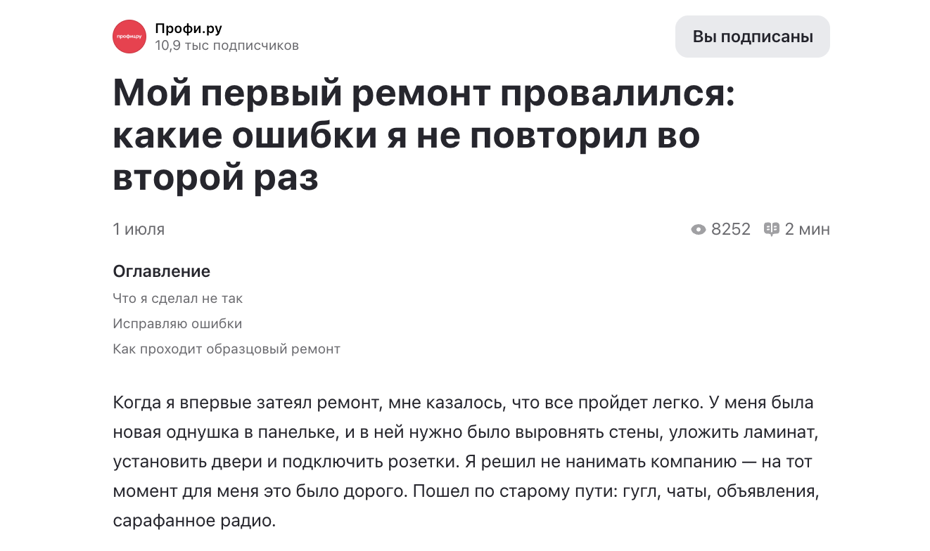 Наш клиент Профи.ру в прошлом месяце именно так стал «блогером» — на канале собралось больше 10 тысяч подписчиков. Мы ничего не делали для этого специально, просто регулярно выпускаем рекламные статьи для Промо на канале бренда.