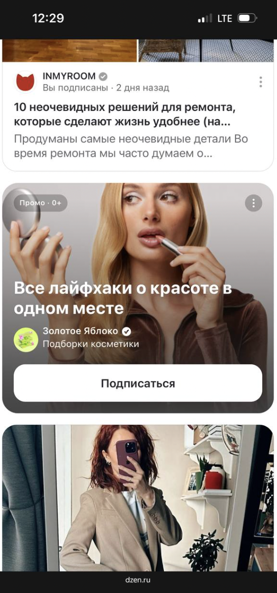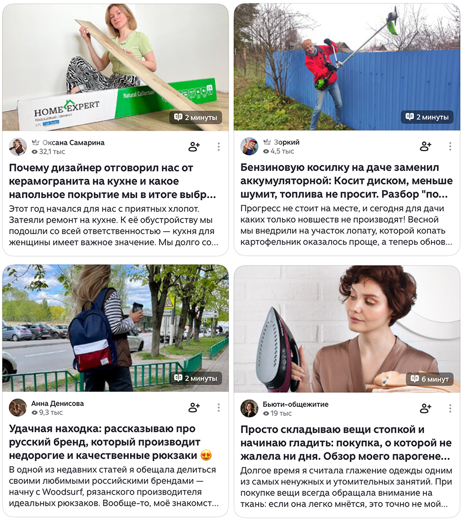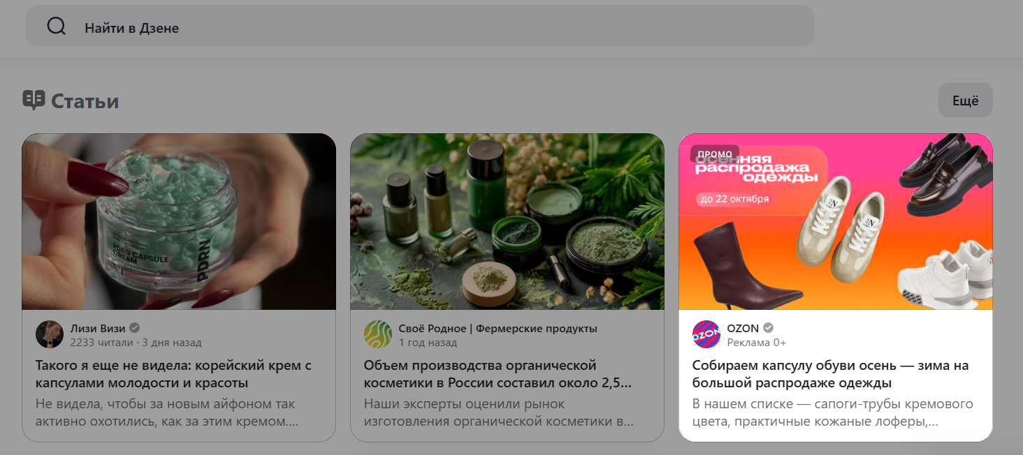 Если у вас есть хорошие статьи про ваш продукт, их можно опубликовать на собственном канале в Дзене и запустить на них платное Промо через VK Рекламу. Тогда статьи будут крутиться в Дзене и Новостях наряду с блогерскими: