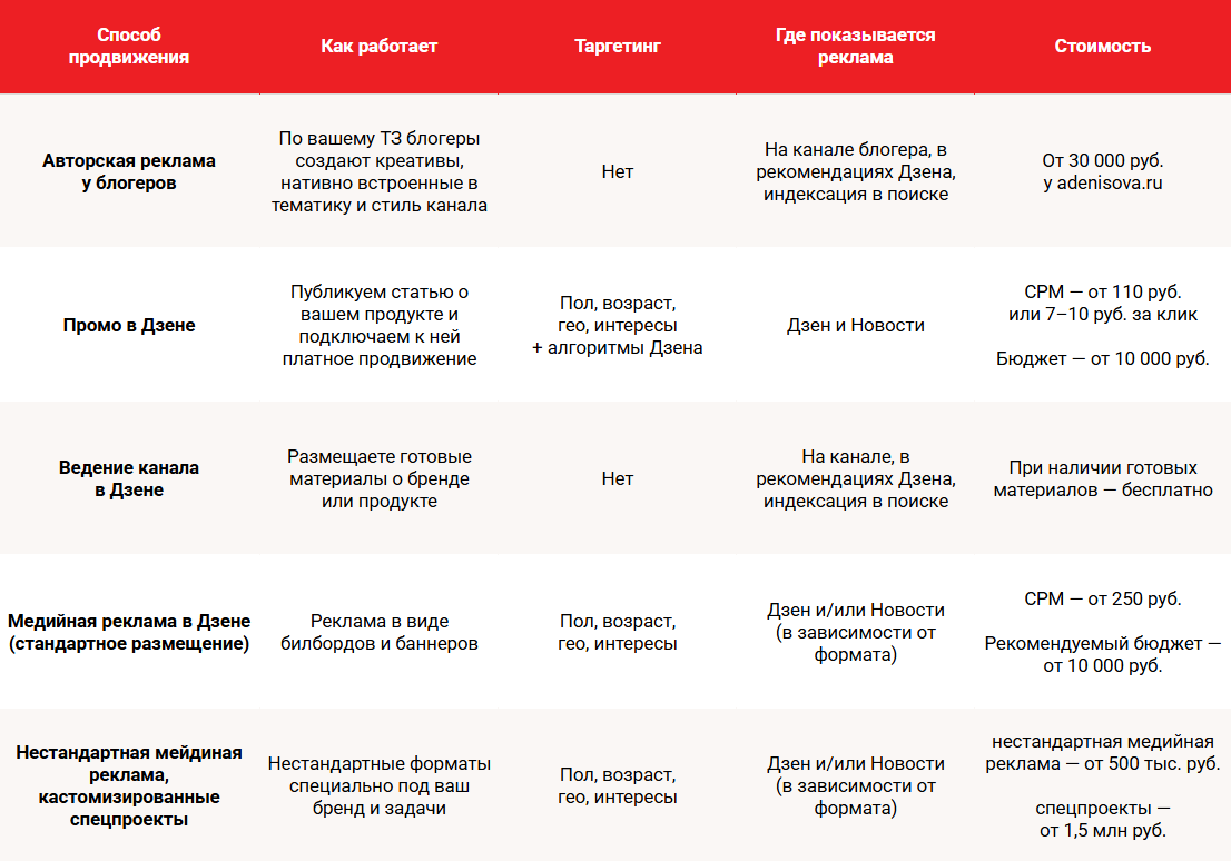 Дзен в 2026 году — это рекламная площадка с гибкими форматами под разный бюджет. Чтобы было проще ориентироваться, собрали все возможности Дзена в таблице. Сохраняйте и используйте в нужный момент.