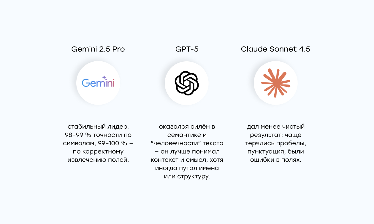 Gemini 2.5 Pro стабильно лидировала: давала 98–99% точности по символам, 99–100% — по корректному извлечению полей, и почти идеальный JSON.