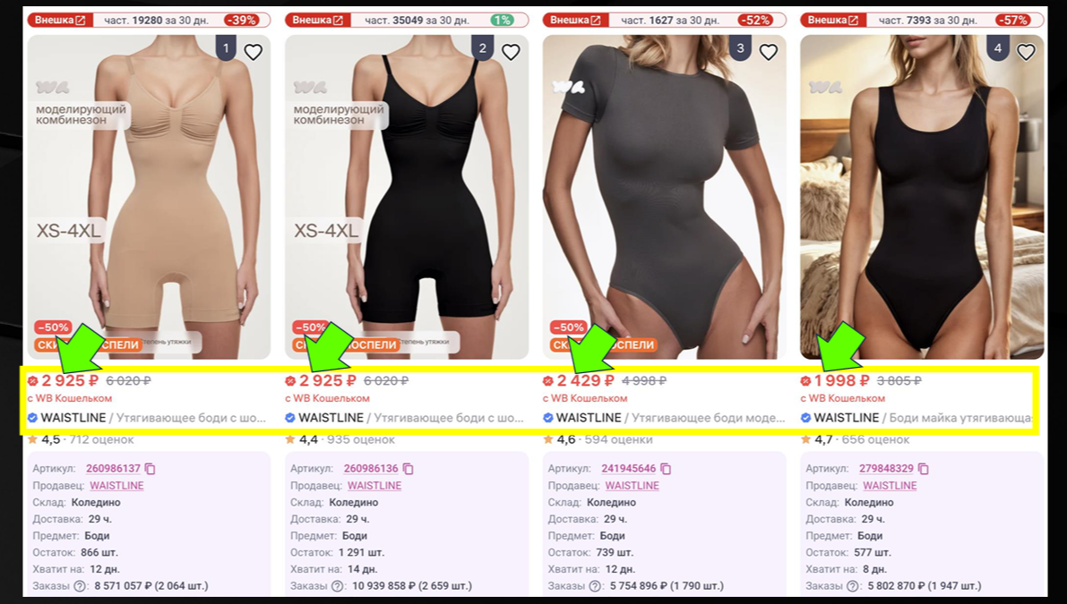 Рассмотрим проект в нише корректирующего белья. Ситуация на рынке была сложной. Конкуренты демпинговали, то есть искусственно занижали цены ради быстрых продаж. Они отдавали товар в среднем за 800 рублей. Мы поставили цель продавать качественный продукт за 2 900 рублей. Это в три раза дороже рынка.