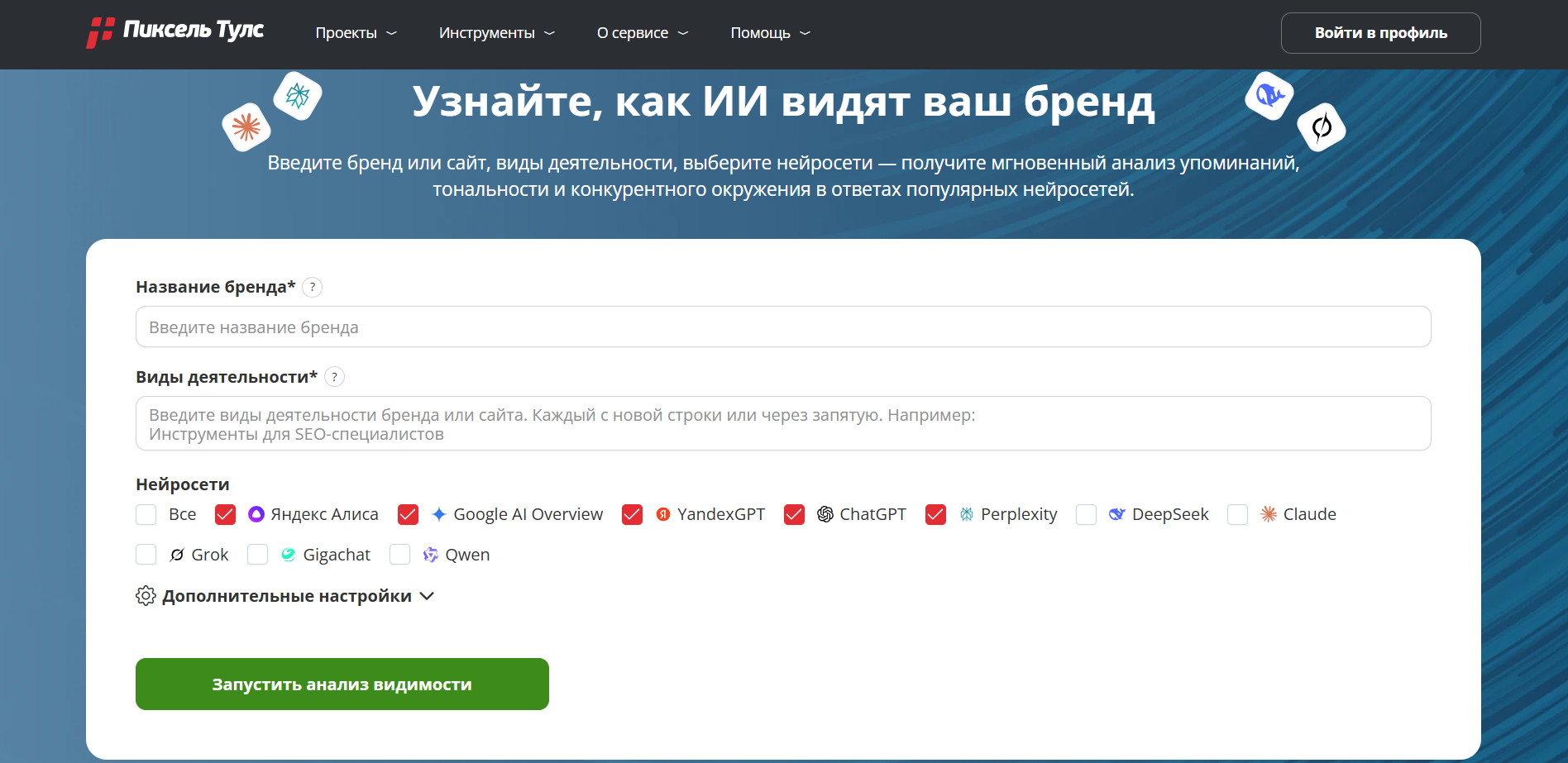 Сервис показывает, упоминается ли бренд в ответах нейросетей.