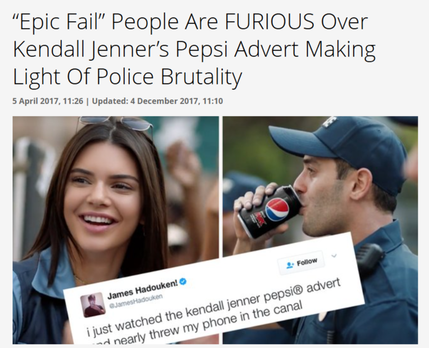 Совсем иначе тот же тренд сработал для Pepsi. В попытке встроиться в повестку бренд выпустил ролик с Кендалл Дженнер, где модель вручает полицейскому банку Pepsi как символ примирения во время протестов. Кампания вызвала волну критики: аудитория увидела в ней попытку упростить и коммерциализировать серьёзное социальное движение.