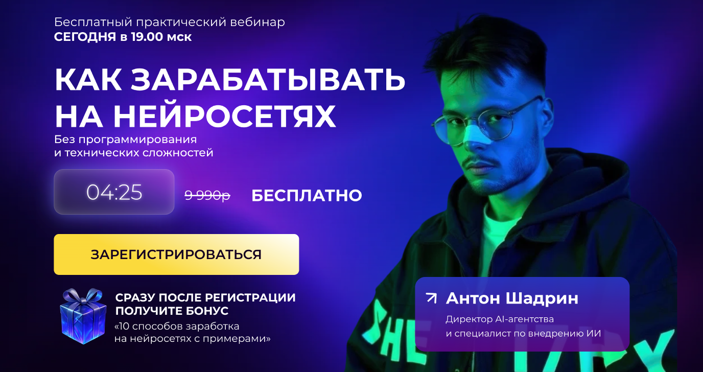 Нейросети не требуют длительного обучения или сложных технических настроек. Базовые сценарии и принципы работы можно понять на практике, разбирая реальные задачи и способы их решения. В таком формате проходит бесплатный практический вебинар «Как зарабатывать на нейросетях без программирования и технических сложностей».