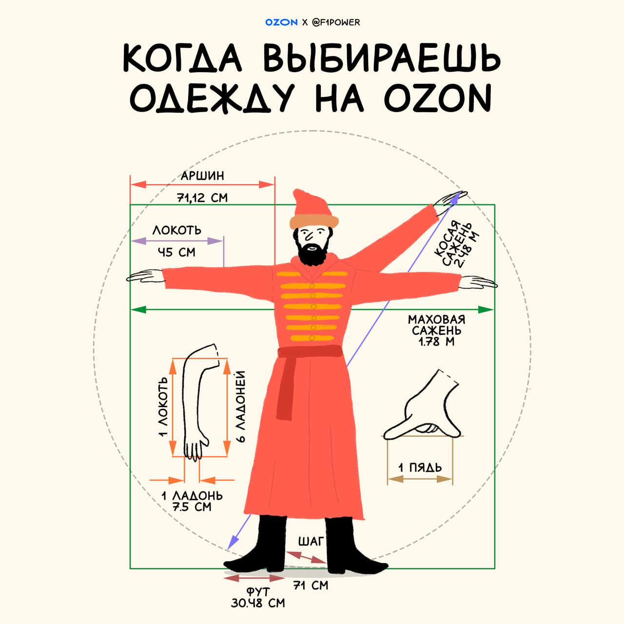 Ozon использует мемный подход «игра вдолгую». Шутка с измерениями в аршинах, локтях и саженях иллюстрирует трудности выбора одежды онлайн и делает продуктовую коммуникацию комичной и близкой аудитории. Здесь бренд опирается на инсайт о сомнениях покупателей, интегрируя культурные коды и визуальный юмор, которые остаются актуальными вне зависимости от конкретного инфоповода.