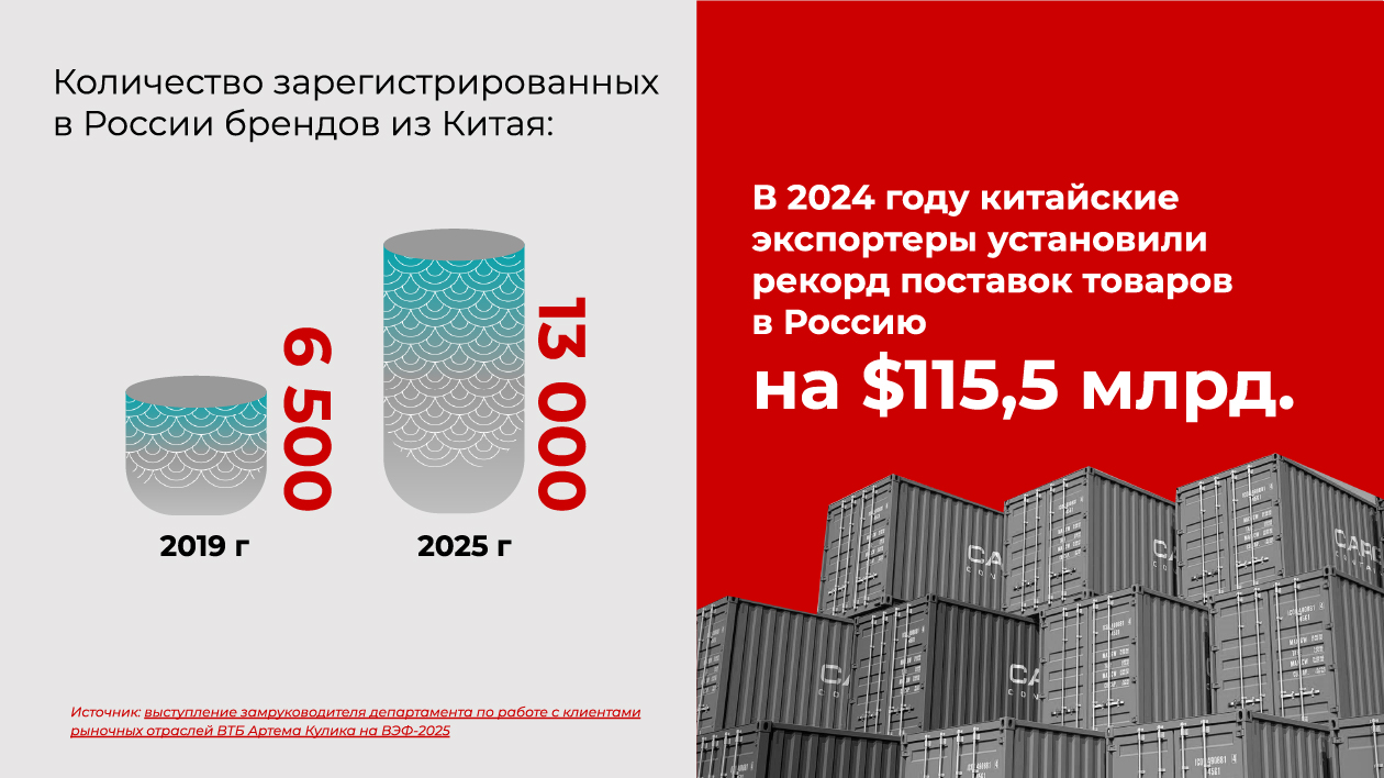 В прошлом году на Восточном экономическом форуме была представлена интересная статистика: в 2025 году в России зарегистрировано около 13 тысяч компаний из Китая, в 2019 году их было в два раза меньше. В 2024 году китайские экспортёры установили рекорд поставок товаров в Россию на 115 млрд $.