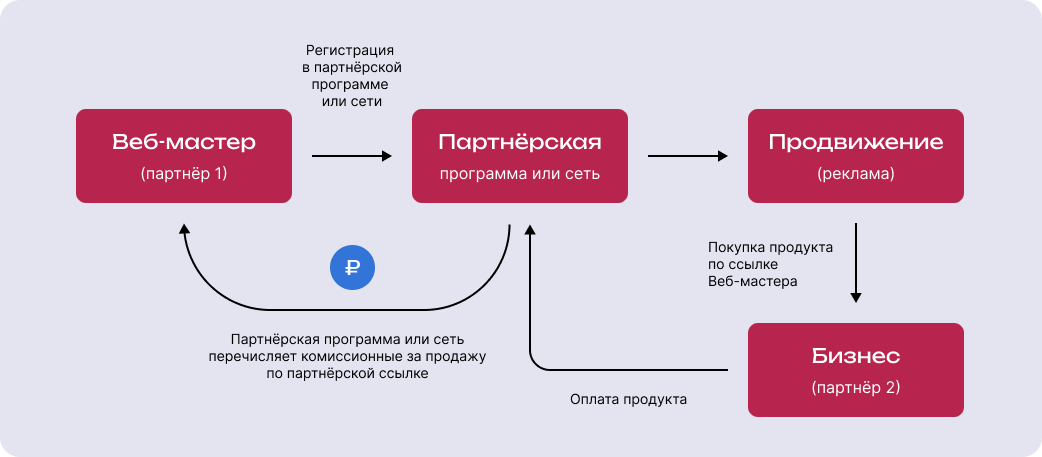 Отношения между партнёрами — чисто денежные. Когда привлечённый веб-мастером пользователь совершает целевое действие — допустим, оформляет заказ, — рекламодатель (бизнес) выплачивает партнёру вознаграждение.