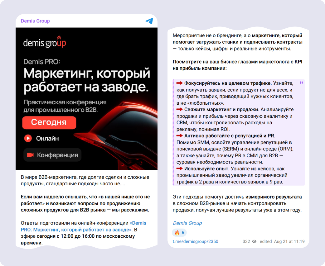 При этом Demis Group работала с целой сетью партнёров — на тот момент она только формировалась как стратегическое направление. Кто-то разместил пост в соцсетях, кто-то сделал рассылку, кто-то подключил сразу несколько каналов. Контент и коммуникации были выстроены по принципу воронки — от первых анонсов и экспертных материалов до напоминаний и постов по итогам мероприятия.