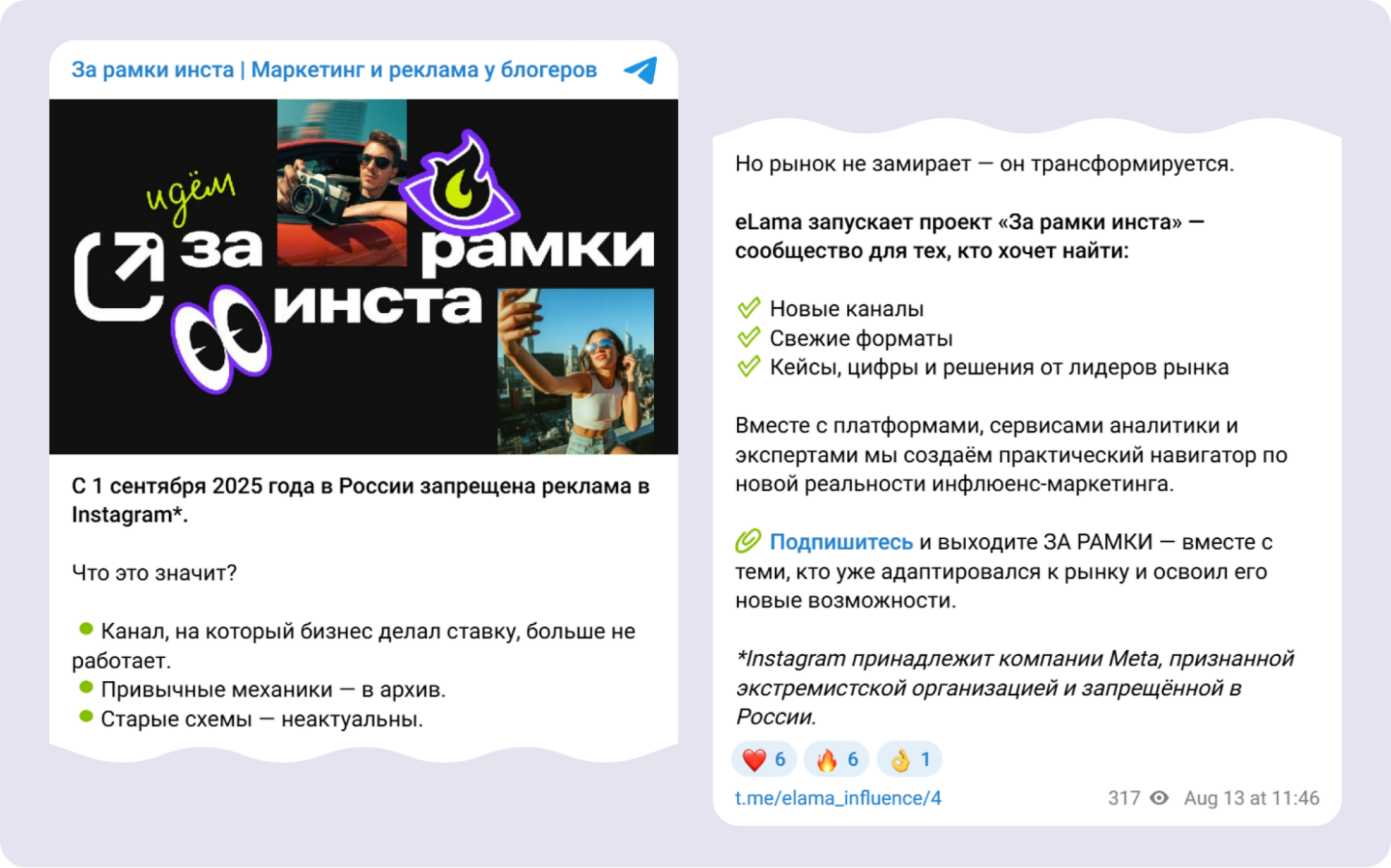 После анонса закона о запрете рекламы в Instagram* игроки рекламного рынка не знали, как теперь продвигать товары и услуги у блогеров, перераспределять бюджеты и что в точности будет регулировать законопроект. В eLama решили, что предложить новый инструмент недостаточно. Важно помочь рынку адаптироваться к изменениям и показать, как действовать в новых условиях. Так появился партнёрский проект «За рамки инста*».