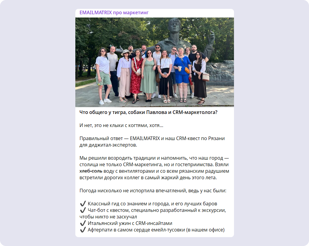 «Крепкое партнёрство возможно только с компаниями, близкими по духу. Например, этим летом в Рязани мы провели офлайн-ивент. Позвали около 15 экспертов по email-маркетингу. Днём гуляли по городу с экскурсоводом, а вечером за ужином обсуждали насущные вопросы индустрии.