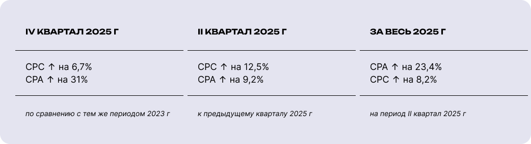 Во втором квартале 2025 года CPC вырос ещё на 12,5%, CPA — на 9,2% к предыдущему кварталу. В годовом выражении цена целевого действия увеличилась почти на четверть (на 23,4%).