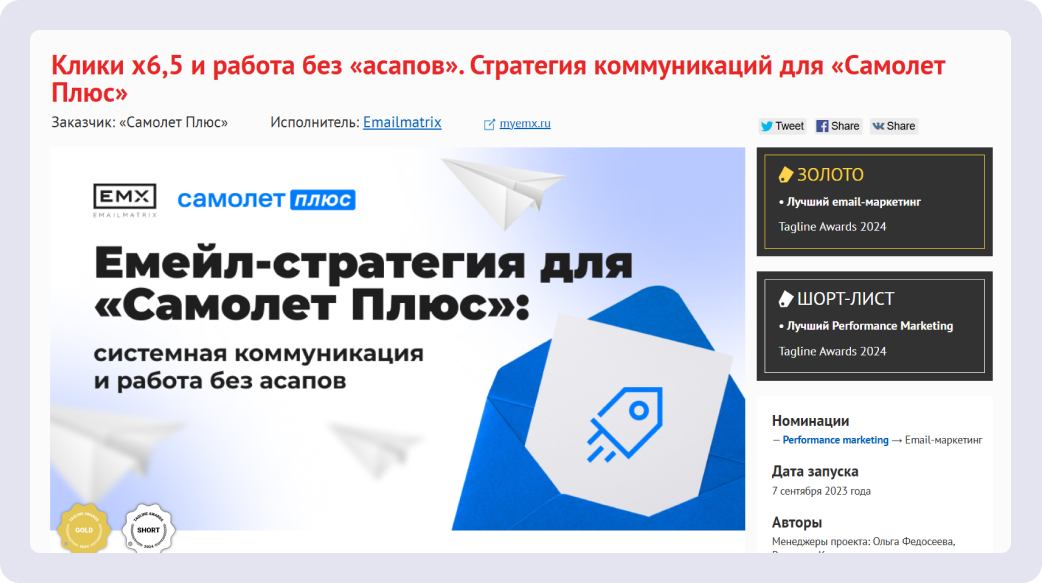 Пример партнёрства, ставшего историей успеха, — работа с компанией Самолёт Плюс. EMAILMATRIX разработали для неё CRM-стратегию, а затем исполнительный директор Павел Ефременко и представитель заказчика рассказали о проекте на профильной конференции. Позже мы переработали выступление в кейс, добавили комментарии клиента и подали материал на премию Tagline Awards — он получил золото.
