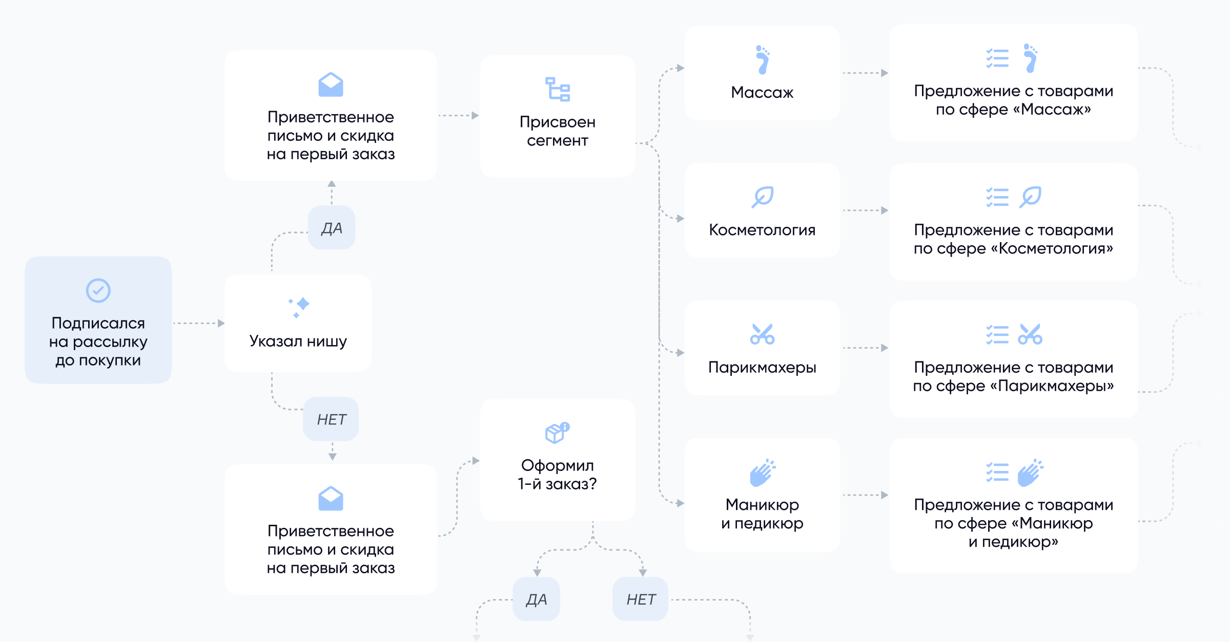 Так, компания-импортёр и продавец оборудования для салонов красоты собирает данные об отрасли своих потенциальных клиентов уже при регистрации. Если в нише указан массаж, клиент получит приветственную цепочку, состоящую из чек-листа по обустройству массажного салона, советов по выбору массажного оборудования и идей по оформлению интерьера.