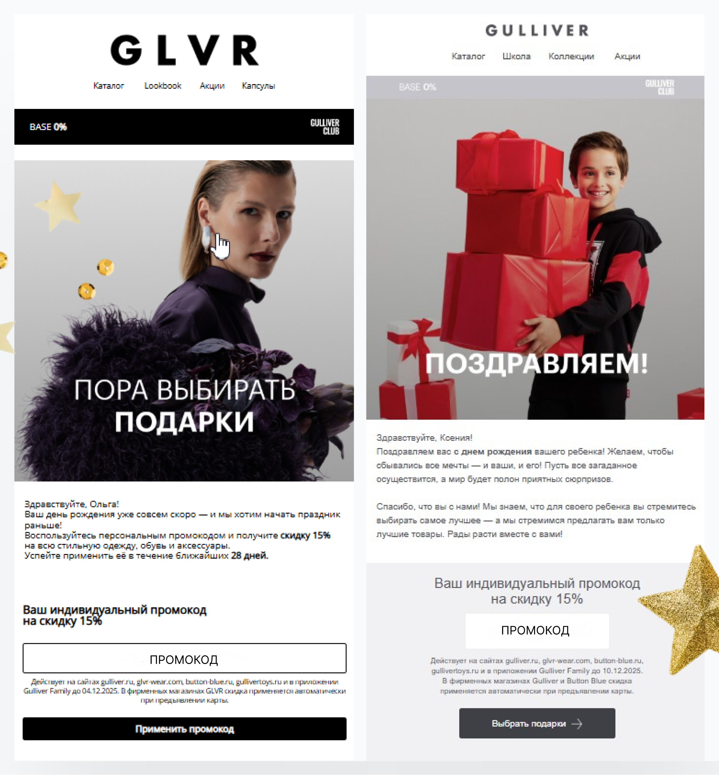Бренд детской одежды Gulliver тоже использует в рассылках важные для клиента даты. На этапе регистрации компания предлагает указать день рождения клиента и его ребёнка, а затем отправляет сообщения с промокодом или товарами со скидкой.