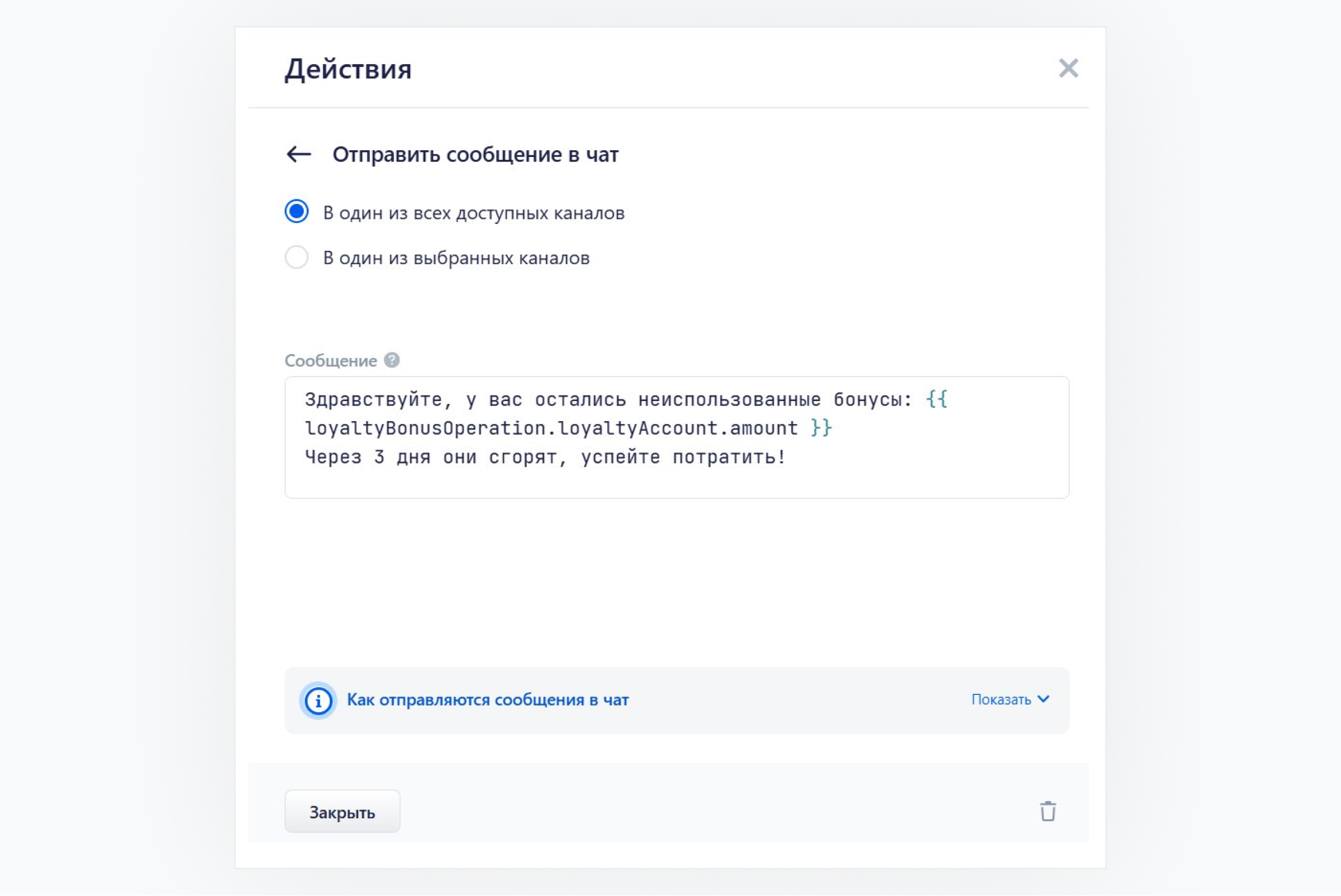 В RetailCRM можно настроить автоматическую отправку сообщений и вставлять нужную информацию в текст. Например, имя клиента и количество бонусов на счету