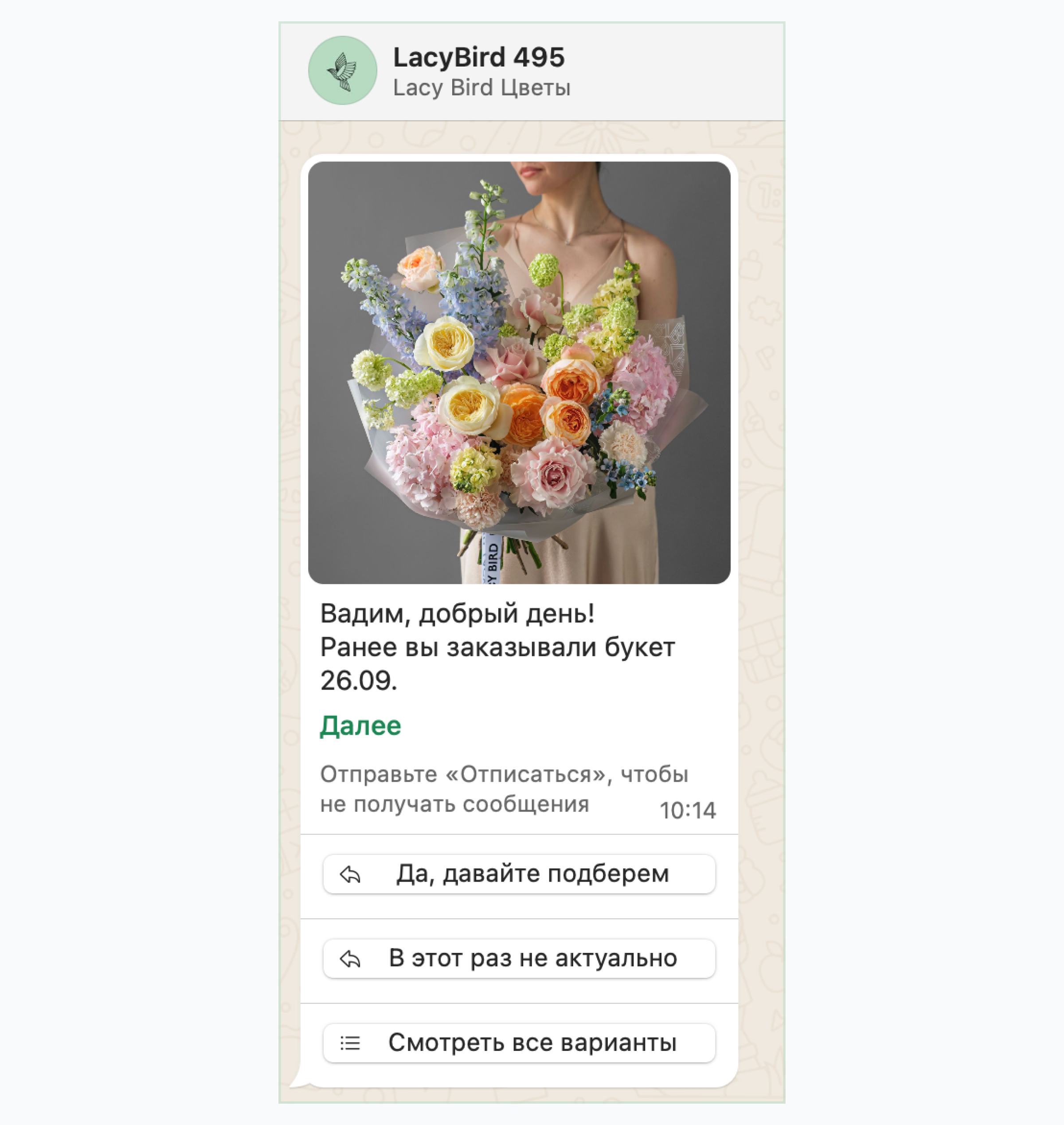 Например, цветочный сервис Lacy Bird анализирует историю заказов и использует их даты как ориентир для новых сообщений. Если человек покупал букет примерно год назад к определённой дате, за несколько дней до неё компания отправляет сообщение с предложением оформить новый заказ.