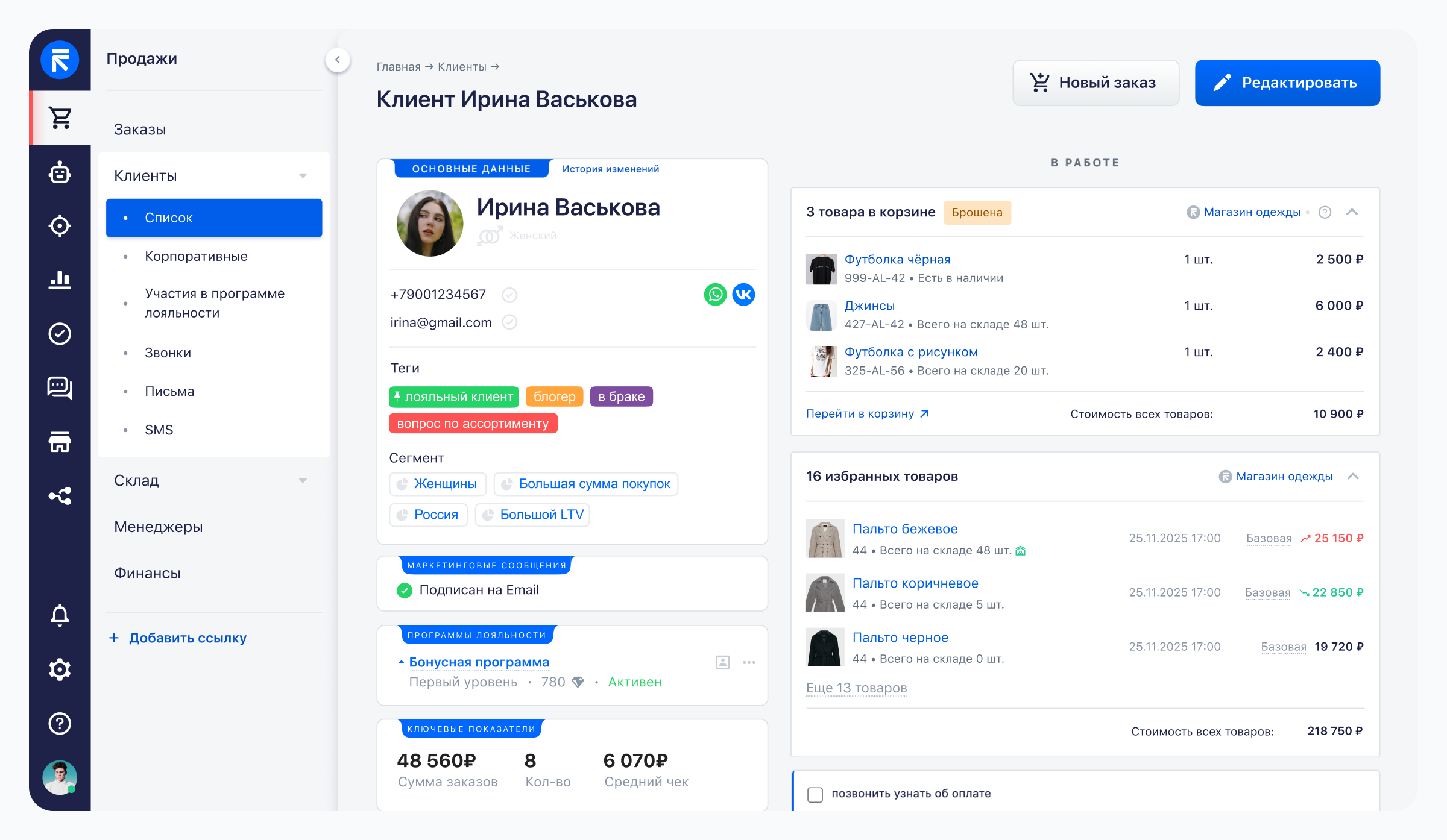 В карточку покупателя в RetailCRM попадают персональные данные, информация о заказах, общении в чате и реакциях на рассылки