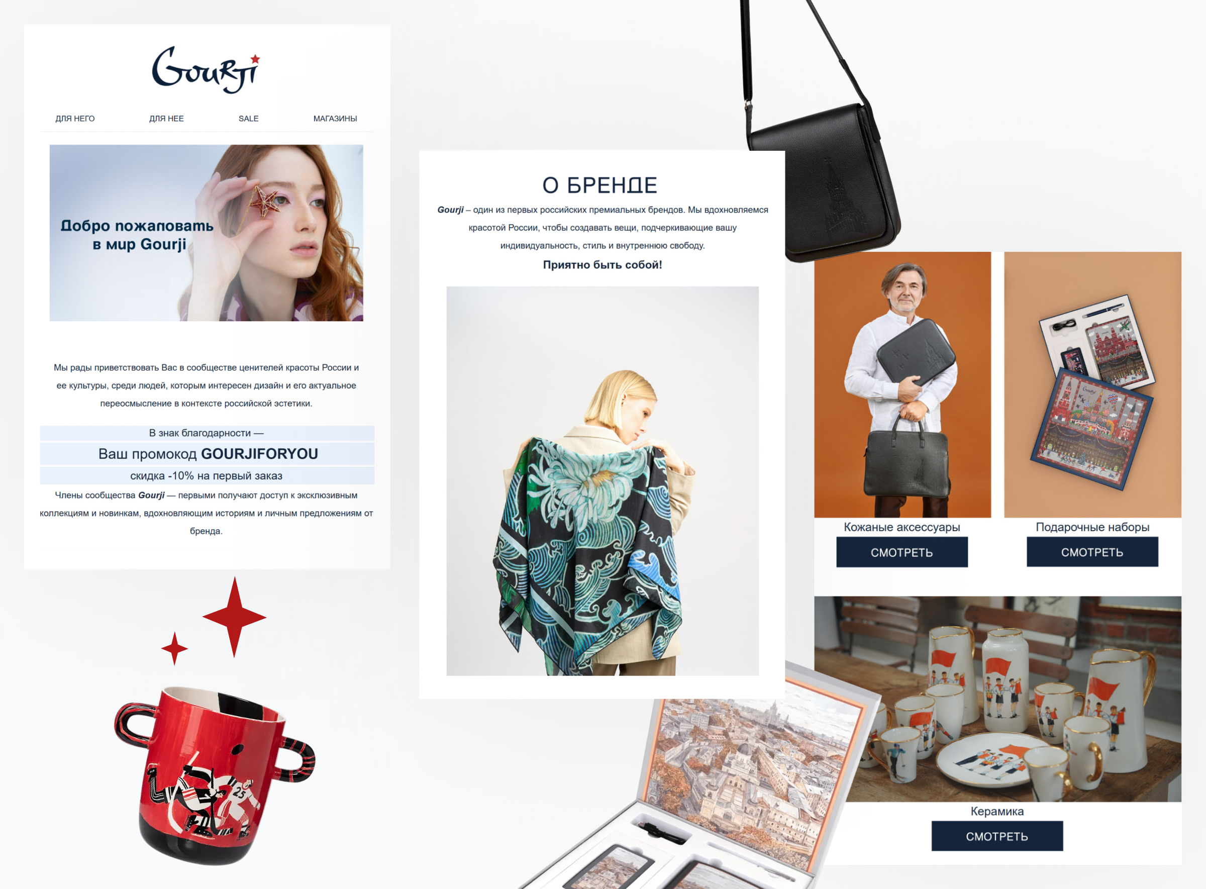 Похожую механику использует российский бренд премиальных аксессуаров Gourji. В имейл-рассылках компания показывает товары из категорий, которыми пользователь интересовался на сайте. Это помогает мягко познакомить человека с ассортиментом и показать релевантные предложения, а не перегружать всей линейкой бренда или массовыми акциями. В результате трафик на сайт из рассылок за год вырос в 2 раза.