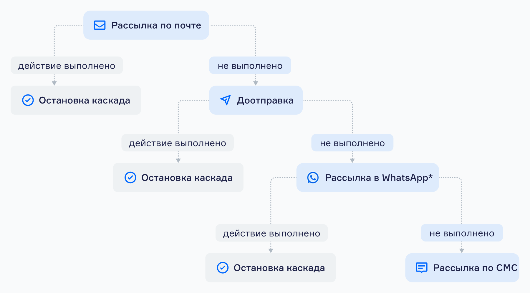 Что важно, сообщения отправляют через каскадные цепочки в RetailCRM. Платформа отслеживает действия клиента и автоматически запускает рассылку в нужном канале. Например, если пользователь не открыл письмо, то ему уйдёт сообщение в мессенджер или в SMS. Это помогает увеличить охват и подключать дополнительные каналы только тогда, когда это действительно нужно.
