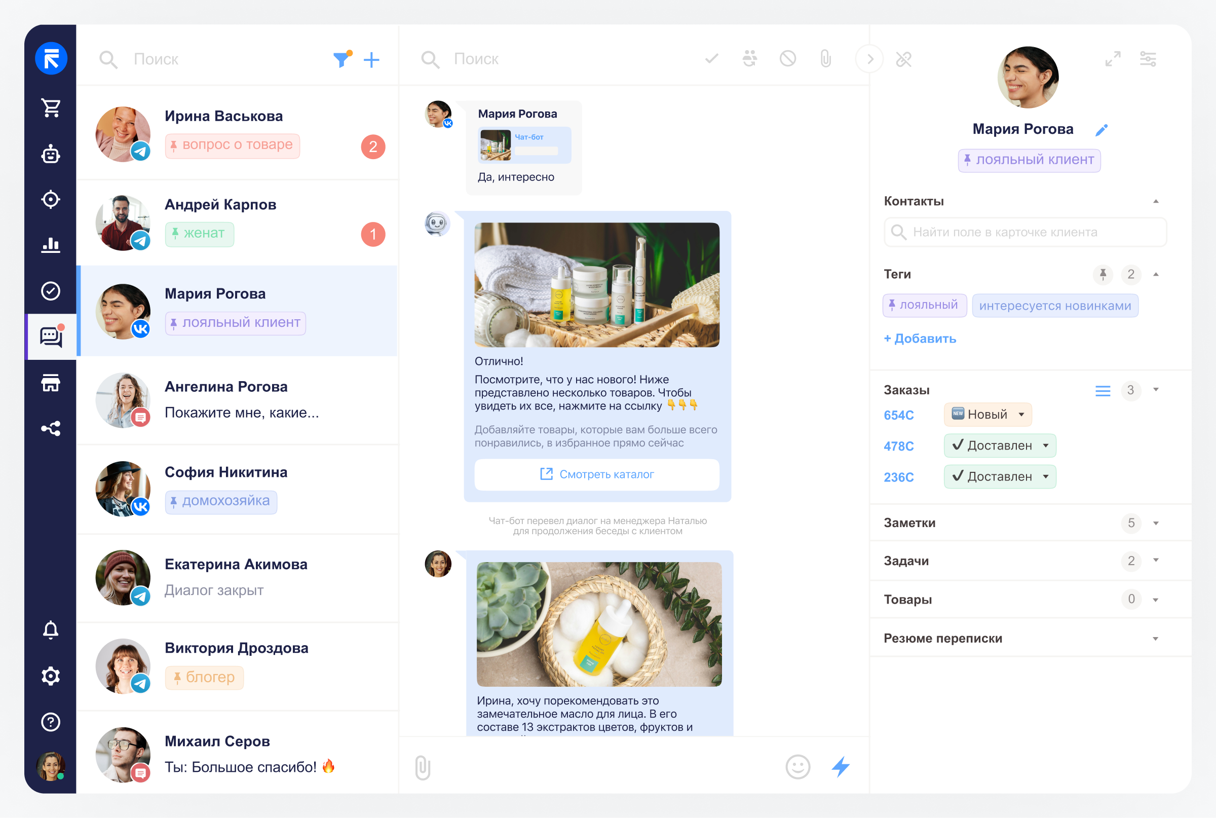 Сообщения из всех каналов и карточка клиента доступны в одном разделе