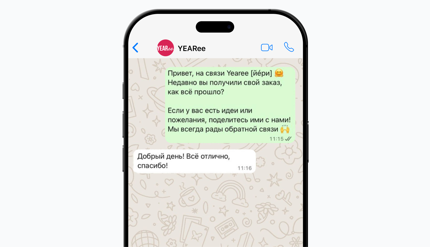 Команда бренда дизайнерских календарей Yearee собирает отзывы клиентов в два этапа. После доставки заказа покупателю отправляют короткое сообщение с вопросом о качестве сервиса и самого календаря. Покупатель чувствует внимание со стороны бренда, а компания получает данные для улучшения продукта и сервиса.