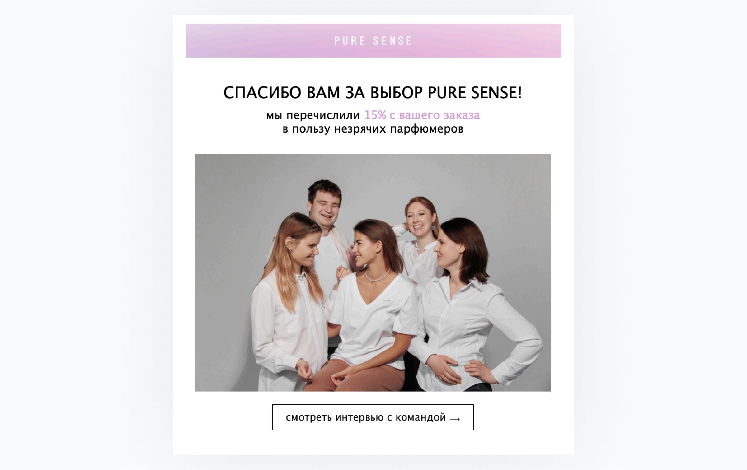 Парфюмерный бренд Pure Sense использует эту стратегию, чтобы рассказать покупателям о благотворительной инициативе. Через некоторое время после получения заказа клиенту отправляют сообщение с благодарностью и информацией о том, что часть средств от покупки направляется на благотворительность.