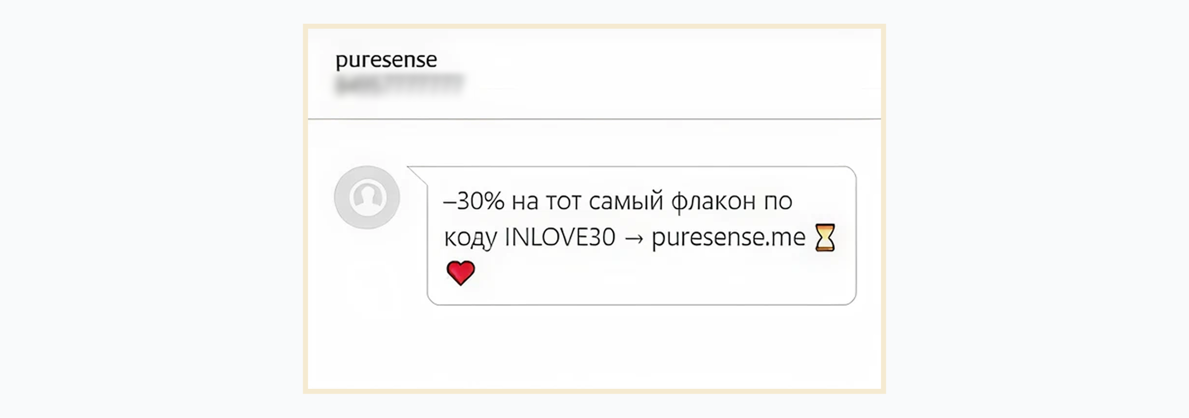 Парфюмерный бренд Pure Sense стимулирует повторные продажи с помощью СМС-рассылок по сегментам. Клиенты получают персональные промокоды или предложения на ароматы из интересных им категорий. В сообщении указывают срок действия скидки и предлагают перейти на сайт интернет-магазина. В среднем касания с учётом сегмента возвращают до 10% получателей к повторной покупке.