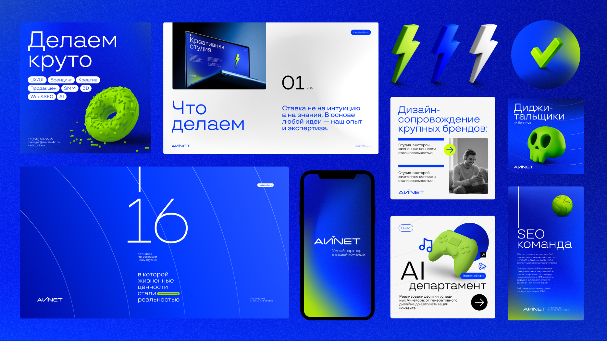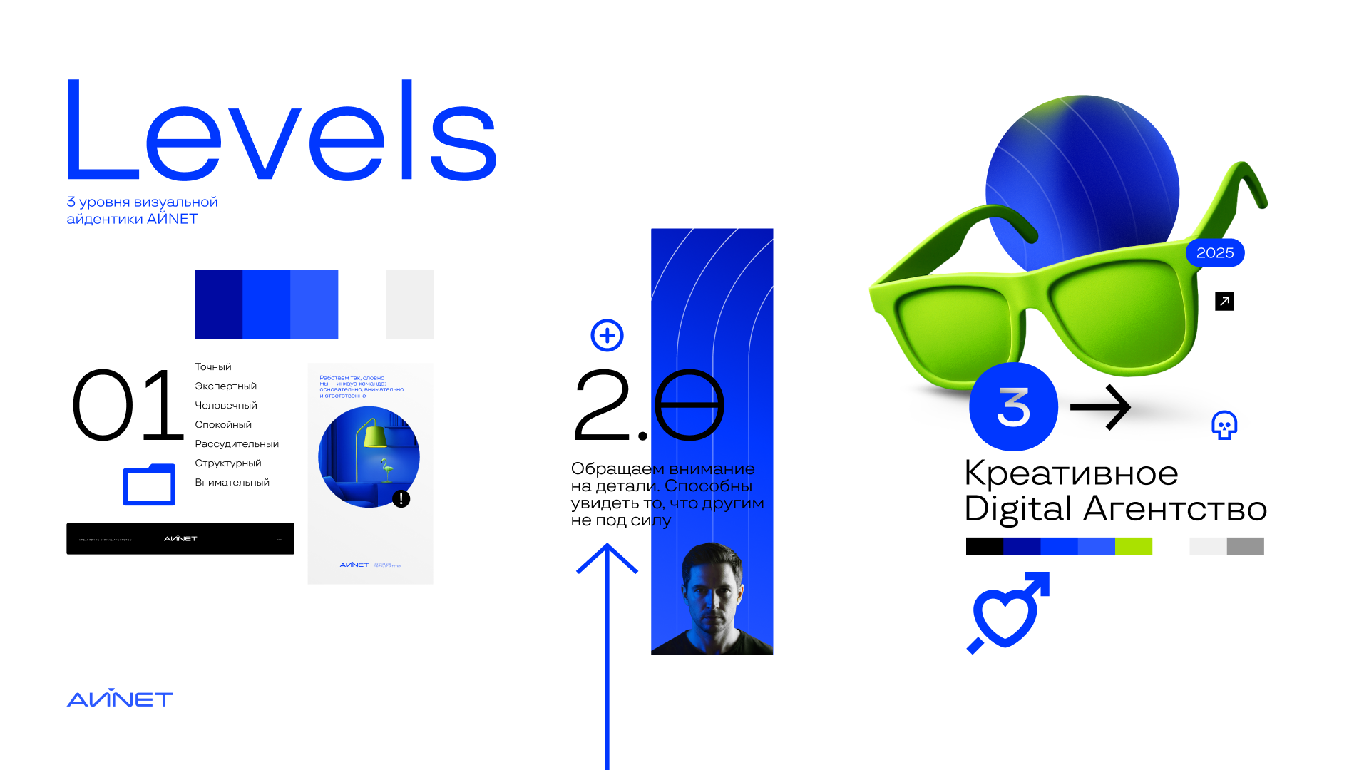 Когда внутренняя модель была выстроена, стало ясно, что внешний образ должен ей соответствовать. Работа над айдентикой стала не редизайном ради обновления, а логичным продолжением трансформации. INET Studio трансформировалась в АЙNЕТ — название, давно использовавшееся внутри команды. Новый бренд объединяет кириллицу и латиницу как метафору соединения цифрового и реального миров. «АЙ» здесь — это и отсылка к искусственному интеллекту, и к личности, людям, культуре. В рамках брендбука была разработана трёхуровневая дизайн-система с ярко выраженным колоркодингом, преимущественным для digital-среды.