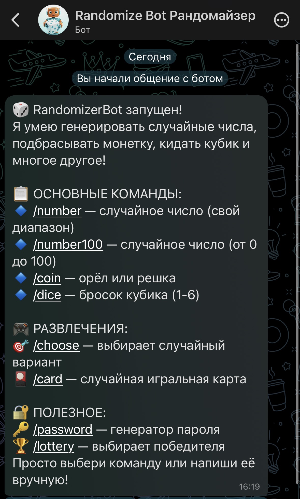 Random Bot — универсальный помощник для принятия решений и генерации случайных данных. Полезен для розыгрышей и распределения задач.