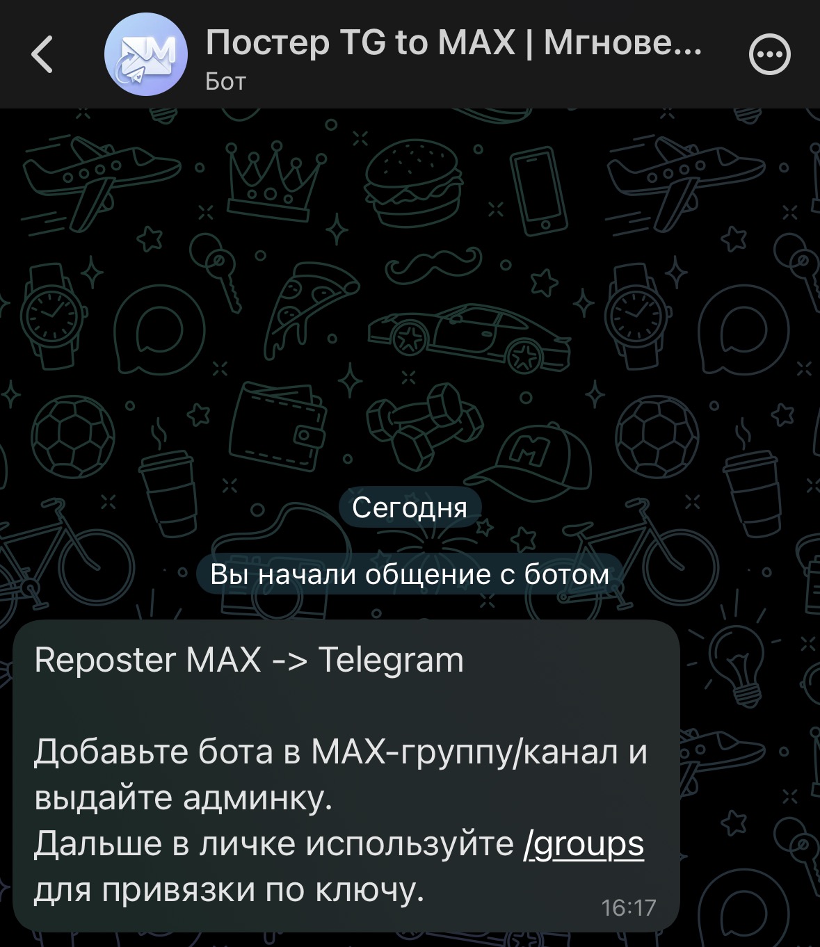 TG to MAX Bot — автоматически пересылает посты из Telegram в MAX. Загруженная в Telegram публикация сразу же появляется на новой площадке. Не нужно тратить время на двойное ведение и дополнительную адаптацию постов.