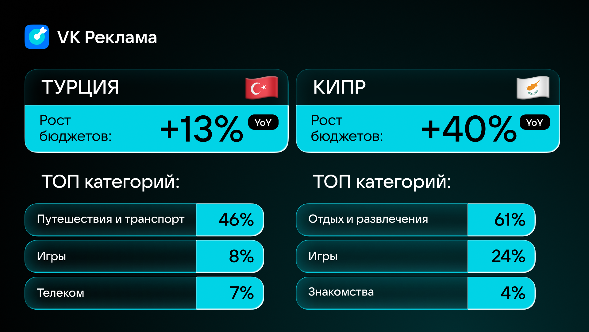 Среди лидеров по динамике роста бюджетов, после Китая, начиная с 2024 года остаются Кипр и Турция. Бюджеты кипрских рекламодателей выросли на 40% год к году. Среди категорий наиболее востребованными оказались «Отдых и развлечения» — 61% всех трат, «Игры» — 24%, «Знакомства» — 4%.